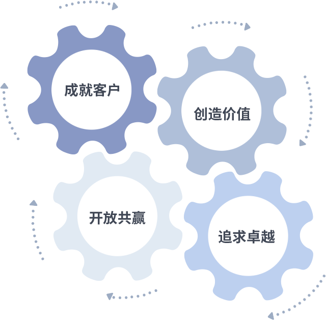 成就客户是一切决策的出发点,,,创造价值是衡量所有工作的标准,,,追求卓越是我们做事做人的态度,,开放共赢是我们的格局也是最终的结果。。。。价值观的齿轮环环相扣,,,推动着组织里的每个人不断向前。。。